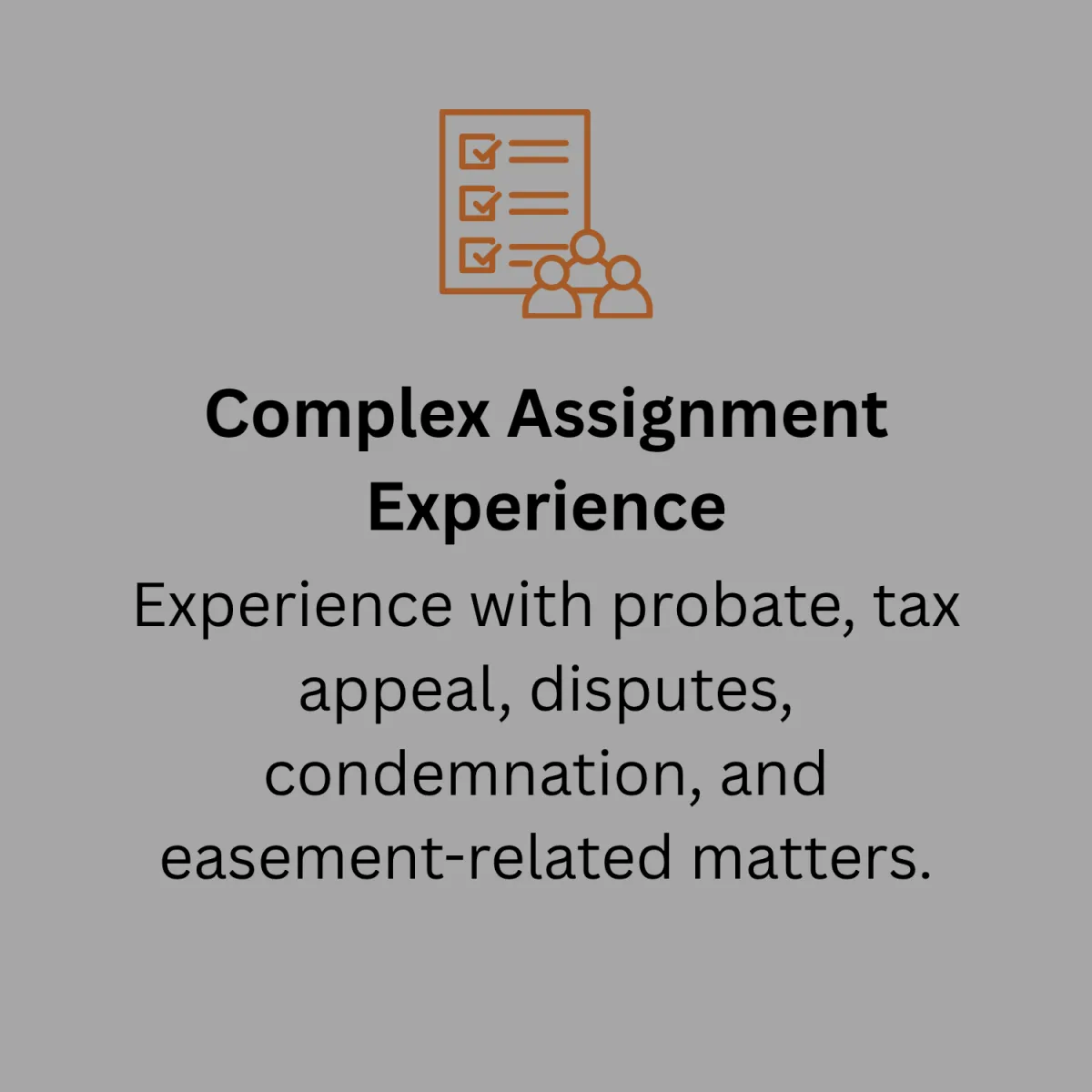 We work on assignments involving probate, disputes, tax appeals, condemnation, easements, and other complex matters.