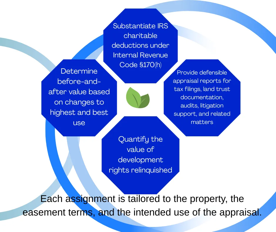 -Valuation support for estate planning, settlement, and reporting involving conservation-restricted properties.