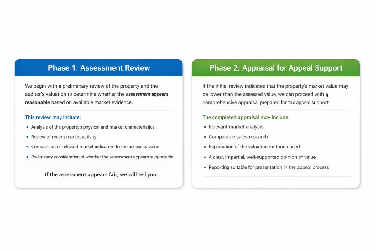 Our work is designed to bring clarity to the process. If the assessment appears fair, we will say so. If the market data indicates the property may be over-assessed, we can provide the appraisal support needed for a formal appeal.